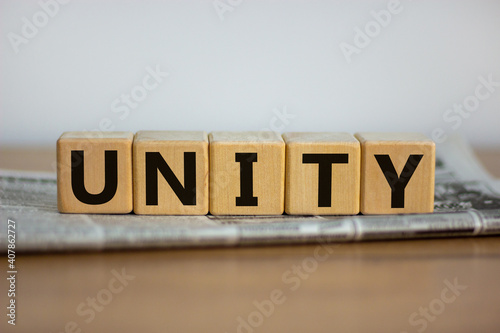 Time to unity symbol. Wooden cubes placed on a newspaper. The word 'unity'. Beautiful wooden table. White background. Business and unity concept. Copy space.