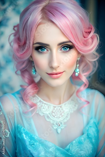 Timeless Elegance: Close-Up of Saira in Victorian Blue with Bubblegum-Pink Hair and Dreamlike Aura
