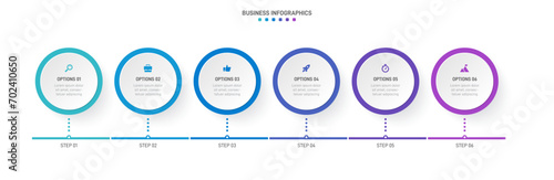Timeline infographic with infochart. Modern presentation template with 6 spets for business process. Website template on white background for concept modern design. Horizontal layout.