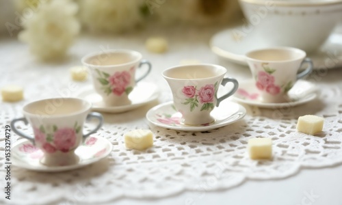 Tiny paper teacups and saucers with floral patterns, arranged on a lace-paper tablecloth with sugar cube details.