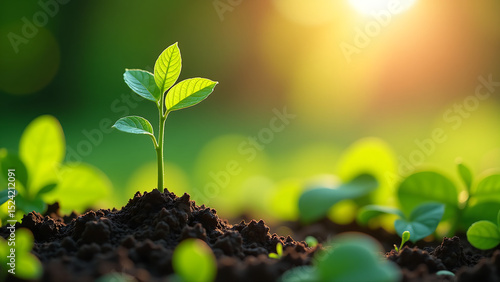 tiny sapling stands tall amidst vibrant green foliage set warm golden morning sun casting gentle shadows delicate roots