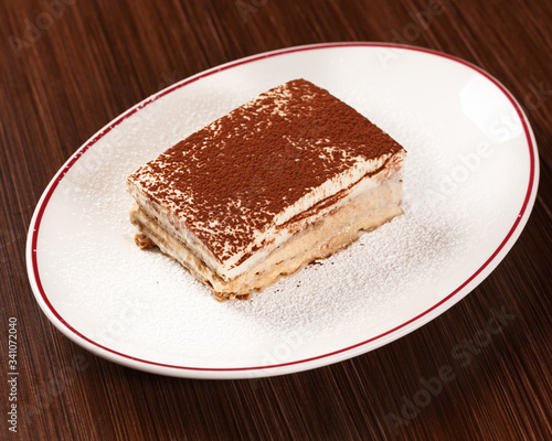 Tiramisu. Original recipe of Italian dessert with cacao powder on top. Authentic Italian cuisine. Wooden table