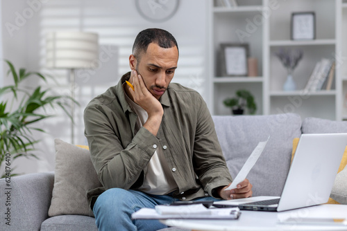 Tired and thoughtful african american man working from home on laptop with documents and bills. Overtime over the deadline