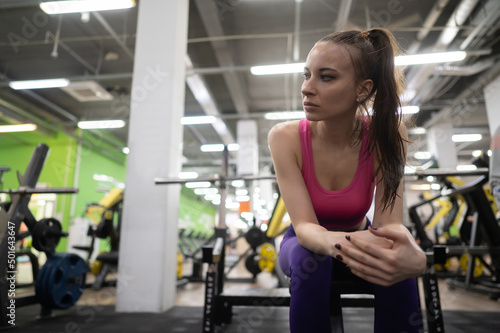 Tired girl is sitting on a bench and resting in the gym