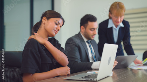 Tired young indian woman working at office. She having painful head feelings due to computer overwork or sedentary working lifestyle.