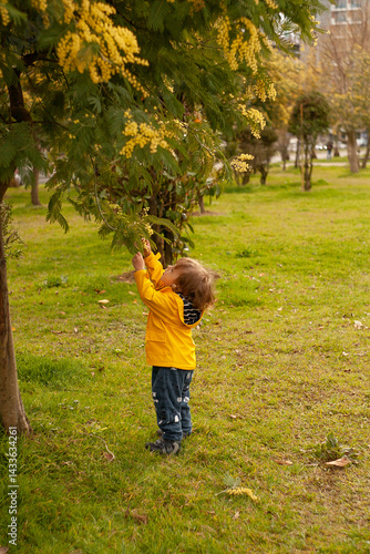 toddler of 3 years old is playing in nature where mimosa trees grow., soft and warm colours