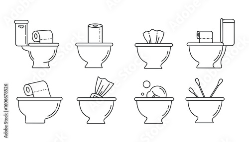 Toilet and Personal Care Items Icons. Set of Illustrations Featuring Toilets and Other Hygiene Products Vector Illustration