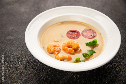 Tom kha soup shrimp, coconut milk, miso paste tasty seafood snack fresh delicious gourmet food background on the table rustic food top view copy space pescetarian diet