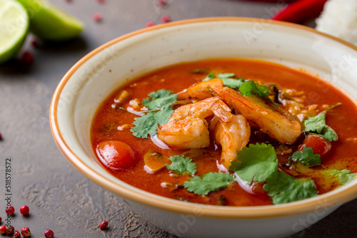 Tom Yam soup with rice and shrimps on brown table macro close up