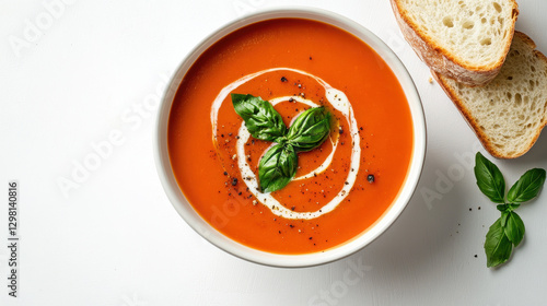 Tomato Soup Delight: A close-up shot of a vibrant bowl of creamy tomato soup, garnished with fresh basil and a swirl of cream, served alongside crusty bread.