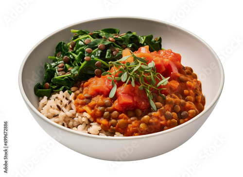 Tomato-garlic lentil bowl on transparent background. Generative AI.