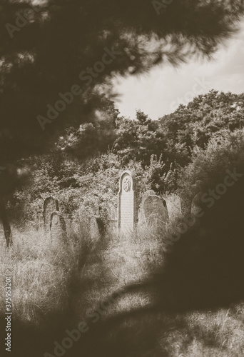 Tombstone at abandoned jewish cemetery in the middle of forest in Zarki, Poland. 18th century graveyard hidden in the woods. Forgotten tombstones and matzevot of dead jews are deteriorating.
