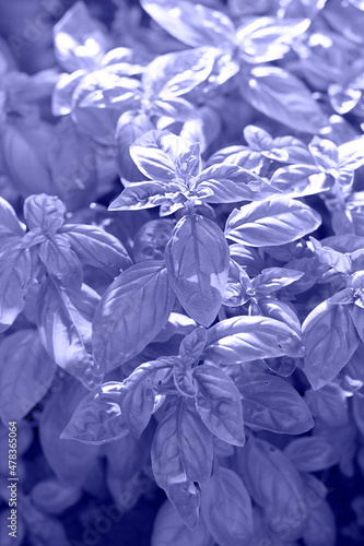 Toned with Very Peri Fresh basil in garden. Vertical background. Food and spices, healthy and tasty ingredient for many dishes, Italian cuisine and Pesto.
