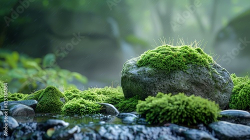 Top of the line CG, surreal photography.Wet moss on stones in a misty woodland after a rain. beautiful, romantic, and beautiful lighting. Blue sky, ultra-high definition, front view, Nikon
