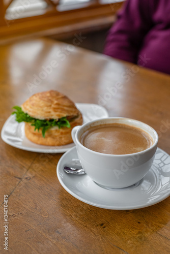 Top view of a breakfast scene featuring a flaky croissant sandwich filled with fresh greens and paired with a steaming cup of rich café crema. Cozy and elegant breakfast concept.