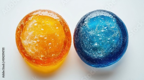 Top view of blue and orange jelly, simple white background, citrus juice droplets, soft textures, bold and striking.