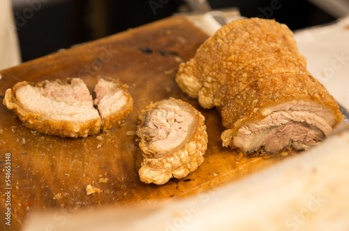 Top view of Chashu Crispy Pork, focus selective