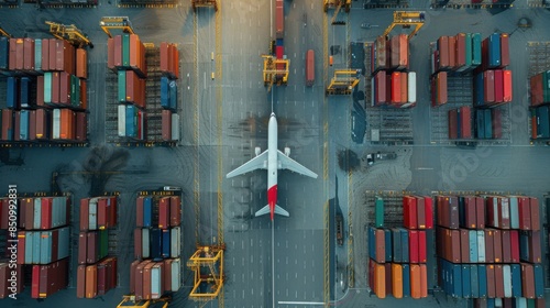 Top View of Efficient Port Logistics: A top view illustrating the efficiency of port logistics with a cargo plane in the sky, containers being moved by cranes, and trucks ready for transport