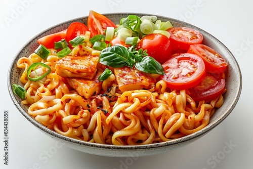 Top view of Malaysian mee goreng isolated on white background showcases its vibrant colors and tempting presentation