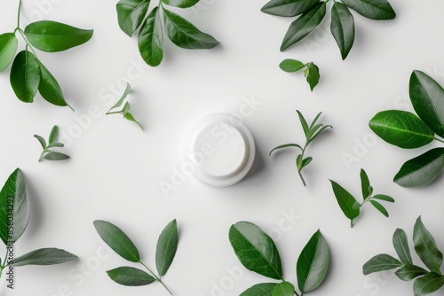 Top View of Organic Skincare Cream Jar Amidst Fresh Green Leaves on White Background