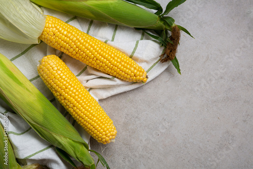 Top view of ripe sweet corn cob on kitchen textile copy space