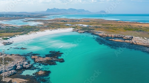 Top view of the turquoise lagoons and white beaches of Langebaan, with the West Coast National Park in the background