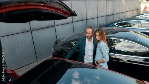 Top view of young spouses choosing new car