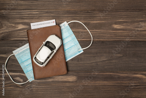 Top view photo of car model on leather passport cover with vaccination card and medical face mask on isolated wooden table background with copyspace