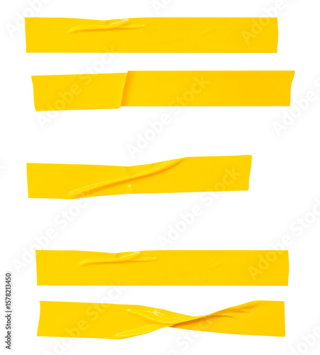 Top view set of wrinkled or crumpled yellow adhesive vinyl tape or cloth tape in stripes shape isolated with clipping path in png file format