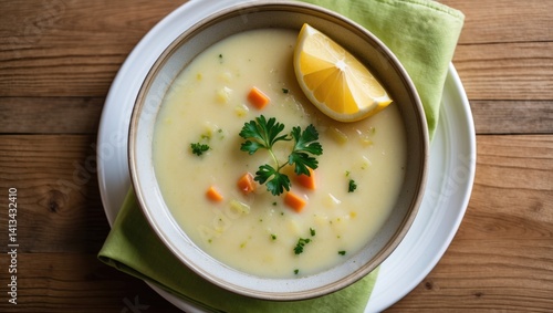Top-down view of white creamy soup with vegetables and lemon slice