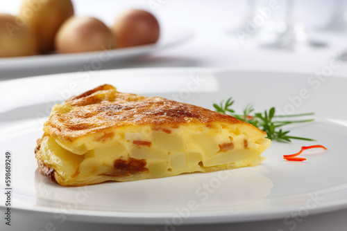 Tortilla de Papas - portion of potato omelette, AI generative traditional dish on white plate
