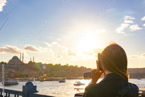 Tourist taking photo of Istanbul at sunset. Travel to Istanbul background photo