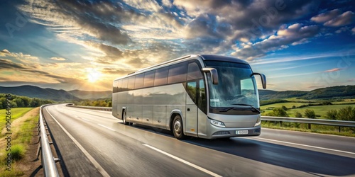 Touristic coach bus driving on a highway road, Tourism, Transportation, Travel, Coach bus, Highway, Road trip