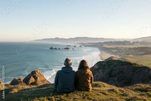 Tourists enjoying scenic coastal view at sunset: admiring ocean waves and cliffs in california