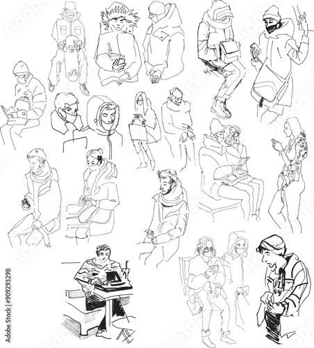Tourists Men Women Sitting Walking Line Isolated White Background. People line art silhouette lifestyle trip transport metro bus waiting plane eating public place guy in hooded jacket phone use