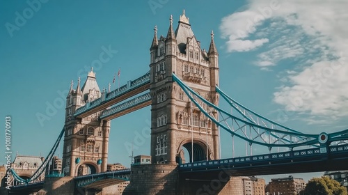 Tower Bridge, a famous London landmark, with its distinctive towers and suspension bridge, against a clear blue sky.