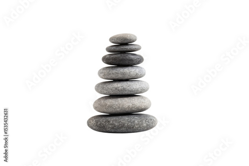 Tower of balanced gray river rocks in cairn formation representing harmony peace and spiritual balance, isolated on a transparent background