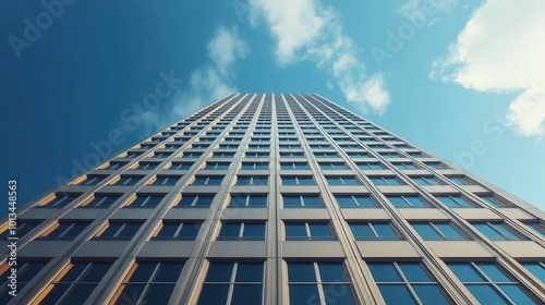 towering skyscraper with unique geometric facade, photographed from street level, dramatic perspective against blue sky