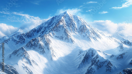 Towering snowy peak with steep slopes and clouds under a bright blue sky