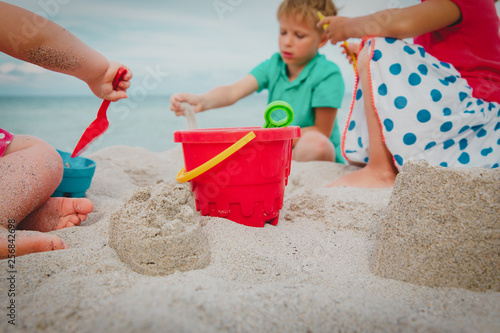toys and kids -boy and girls- playing on beach