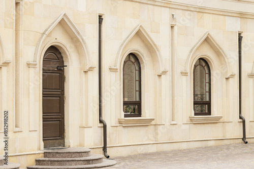 traditional Arabic Muslim architecture facade of living campus in Middle East region perspective building walls external side entrance door and windows arch shape pattern