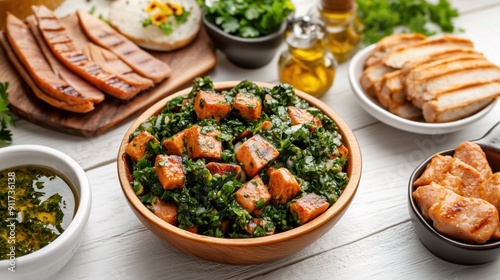 Traditional Brazilian food Torresmo. The image showcases fried pork belly cubes served in a wooden bowl with herbs, accompanied by sliced grilled meat, green sauce, and sides.