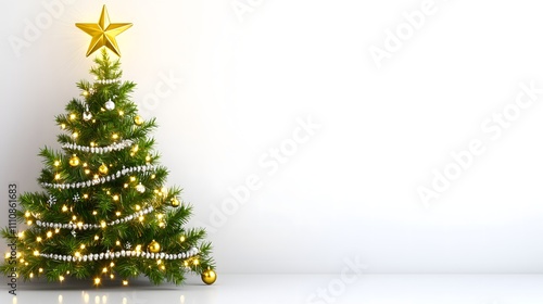 Traditional Christmas tree adorned with golden ornaments, white garlands, and a glowing star on a bright backdrop.
