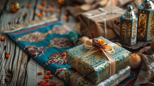 Traditional eid gifts - eid al adha mubarak background with wrapped presents and islamic decorations in a festive setting