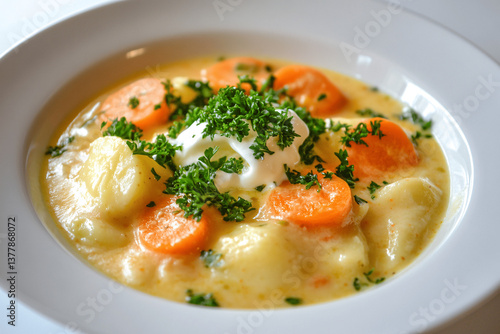 Traditional German Kartoffelsuppe, creamy potato soup with vegetables and parsley garnish