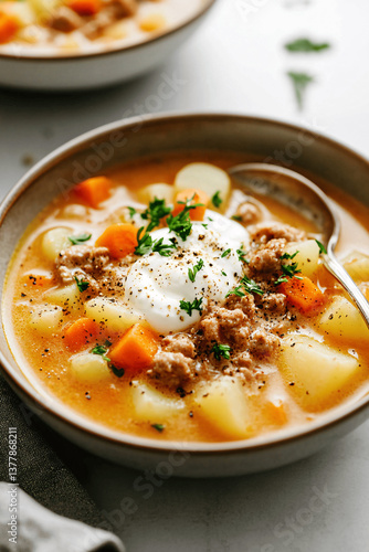 Traditional German Kartoffelsuppe, creamy potato soup with vegetables and parsley garnish