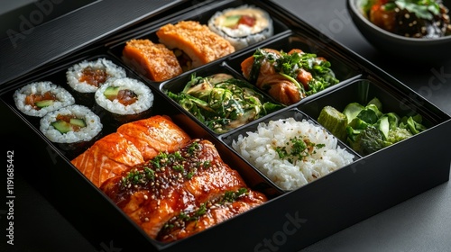 Traditional glossy bento box containing teriyaki salmon, sushi rolls, fluffy steamed rice, pickles and fresh vegetables on a black background with soft lighting
