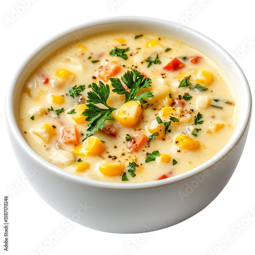 Traditional Homemade Corn Chowder in White Bowl isolated image on white Background.
