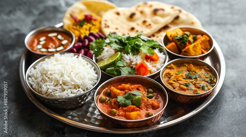 Traditional Indian thali with various dishes including curry, naan, rice, and chutneys, served on a metal platter