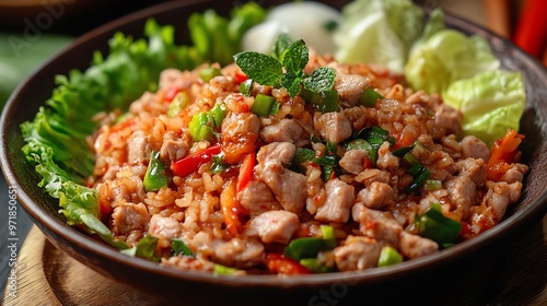 Traditional Isaanstyle spicy pork salad with roasted rice, Isaan pork salad, authentic Isaan dish